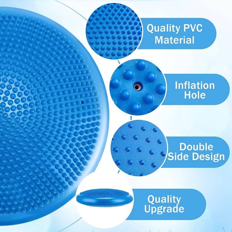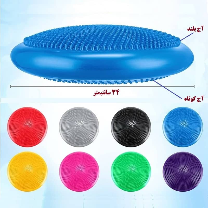 هنگام ایستادن یا نشستن روی کوشن بال می توانید هر دو طرف را انتخاب کنید. یک پمپ هوا در آن تعبیه شده است تا بتوانید به دلخواه هوای بیشتری اضافه کنید. حتماً محدودیت وزن برای بالشتک تعادل را بررسی کنید.