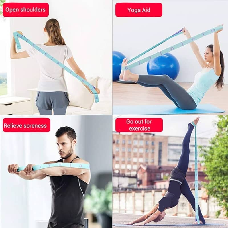 2-باز کردن شانهها کش یوگا را کمی پهنتر از عرض شانۀ خود با هر دو دست بگیرید. دستها را مستقیم جلوی خود آورده و دوباره بالا و سپس پشت سر خود ببرید.اینیک روش مؤثر برای باز کردن شانهها و اطمینان از راحت انجام دادن حرکات است. دستهایتان را بهاندازۀ کافی از هم فاصله دهید و هرگز بیشازحد برای به عقب بردن دستهایتان به خود فشار وارد نکنید.