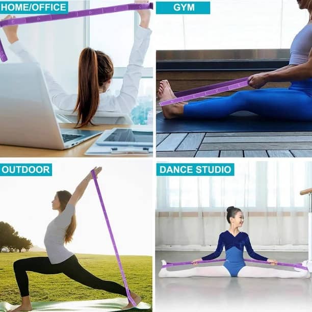 1-کشش به طرفین برای کشش دستها، شانهها و پهلوهای بدنتان، کش یوگا را کمی بیشتر از عرض شانهتان با دستهای خود گرفته و بهآرامی از یکسو بهسوی دیگر بروید. شانهها و پهلوهای بدنتان را کشیده و بازکنید.